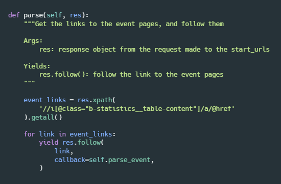 In the parse method, I use the xpath method to get the links to the event details page for each event. Then I iterate through the event links, and call the follow method on each link. Note that the follow method received a callback argument. This callback (called parse_event) will be executed per each request to each event details page.