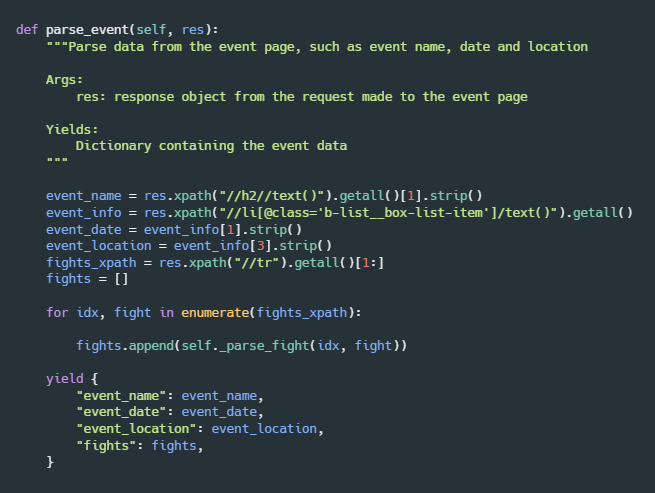 The parse_event method extracts the information about the event, such as the name of the event, its date and location. Moreover, parse_event extracts a list containing the rows (tr elements) that correspond to every fight in the event, and stores the list in the fights_xpath variable. Then it iterates through the list of rows, and appends the returned value of the _parse_fight method (which will be explained next) to the fights list. Lastly, parse_event yields a dictionary with the event information.