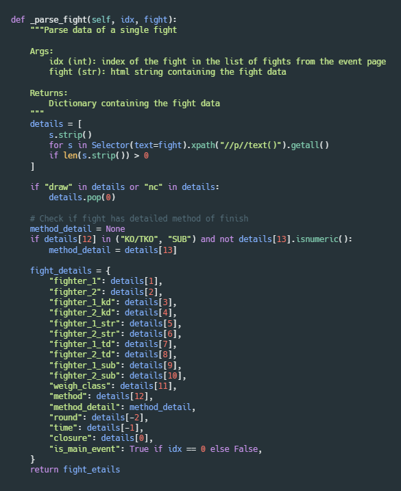 Similarly, the _parse_fight method receives a row containing the data of a specific fight. Then it extracts all the text content from the row and puts it into a “details” list. This list will contain the details of the fight (in a very specific order), such as the names of the fighters, how long the fight lasted, how many strikes were thrown, etc. Lastly, the _parse_fight method returns a “fight_details” dictionary, which contains the same data from the “details” list but with keys.