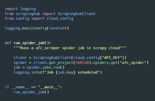 The easiest answer to the first question is scrapy cloud. Scrapy cloud provides a simple interface so that you deploy your scraper from a GitHub repo. Furthermore, a Python library called scrapinghub provides a client interface to connect to scrapy cloud. This library allows you to run your scraper in the cloud programmatically. Here is a simple script that uses scrapinghub to run the ufc spider.