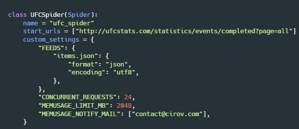 A spider is a Python class, which inherits from the Spider class (from the Scrapy module). Spiders must have two required properties: name and start_urls. The start_urls property specifies in which URLs the spider will start crawling data. Also, spiders can have another property called custom_settings, where you specify, among other settings, how the data is saved after scraping.
