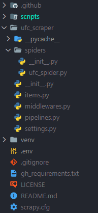 The scripts and .github folders are for automating the scraper runs (more on that later). For now, let’s focus on the spiders folder, and specifically, on the ufc_spider.py file.